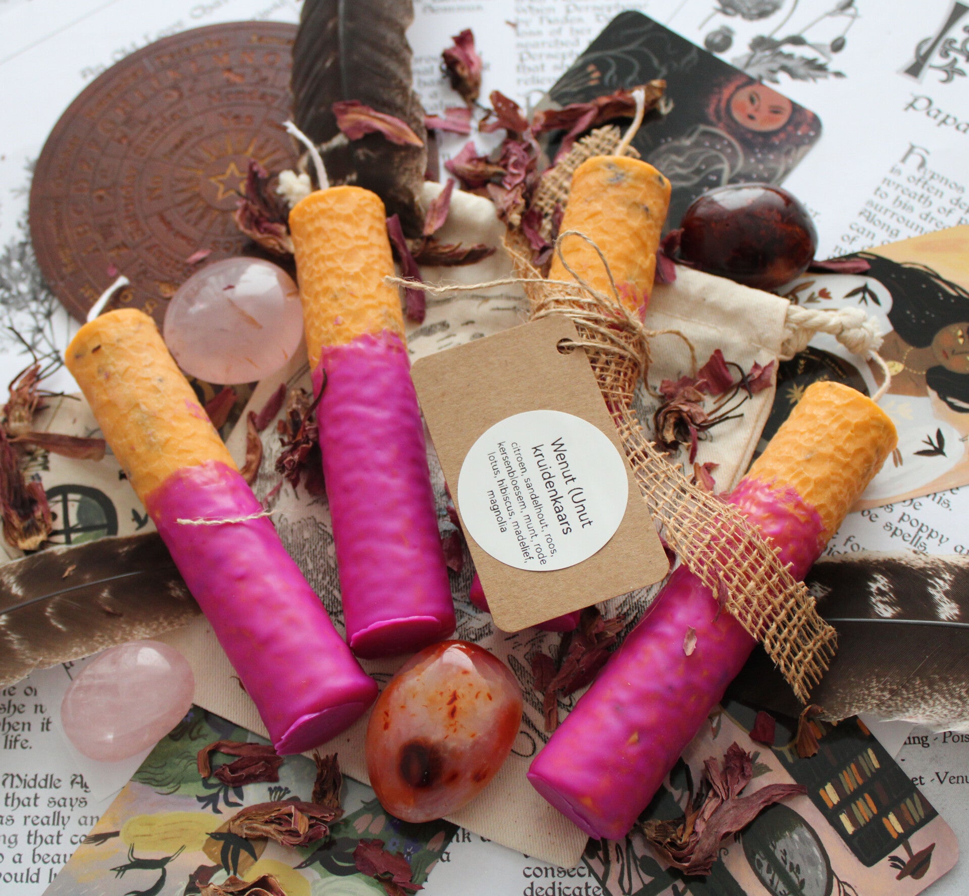 Elke kruid, bloem speelt een unieke en betekenisvolle rol bij het maken van een rituele kaars. In samenwerking met het element vuur worden deze zorgvuldig gekozen ingrediënten ritueel en symbolisch verbrand. Dit krachtige proces versterkt de energie van je ritueel en helpt je intenties te manifesteren. Elk kruid heeft een specifieke verbinding met een element en wordt bewust in kleine hoeveelheden toegevoegd. Denk bijvoorbeeld aan drie rozenblaadjes, een snufje zout, een enkel laurierblaadje of een paar kruidnagels.