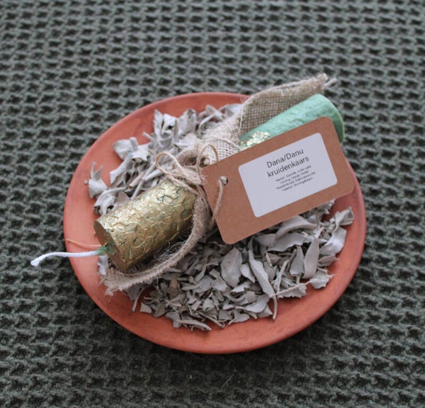 - De Dana / Danu kruidenkaars is gemengd met essentiële oliën Patchoeli, Venkel, Kamille, Witte salie