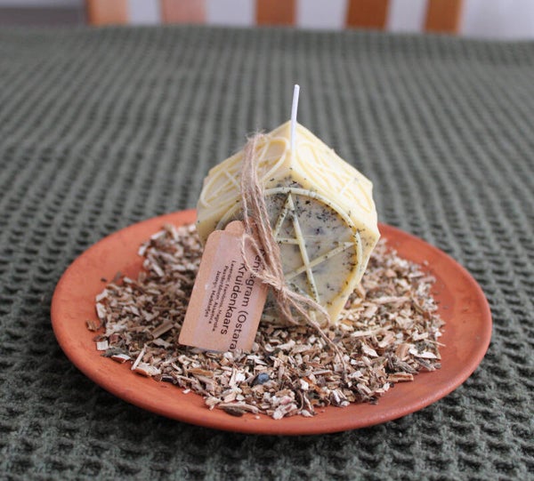 - De kruidenkaars is versierd met planten met magische en positieve eigenschappen. Framboos, Madeliefjes, Jasmijn, Paardebloem, Magnolia bloesem, Assamica