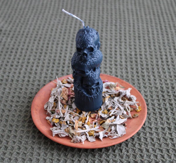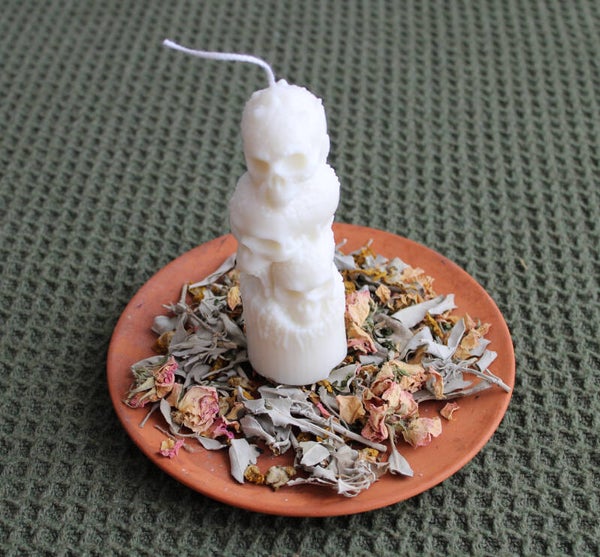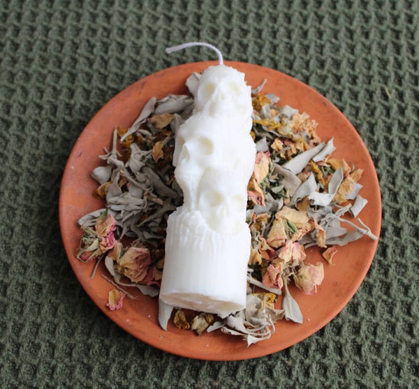 Altaarkaars in de Vorm van Drie Schedels Pilaar – Prachtig en Betekenisvol Ontdek de krachtige energie van deze unieke kaars, ontworpen in de vorm van drie schedels. Deze symboliseren de cirkel van leven en dood, wedergeboorte, en kunnen helpen bij het versterken van connecties met overleden dierbaren. Perfect voor diverse rituelen en spirituele beoefeningen. Een ware toevoeging aan jouw rituele momenten.