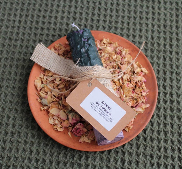 - De Artemis kruidenkaars is verrijkt met een zorgvuldig geselecteerde mix van essentiële oliën, waaronder Sandelhout, Wilde roos, Jasmijn, Eikenschors, Wilg, Mimosa-schors en Patchouli.