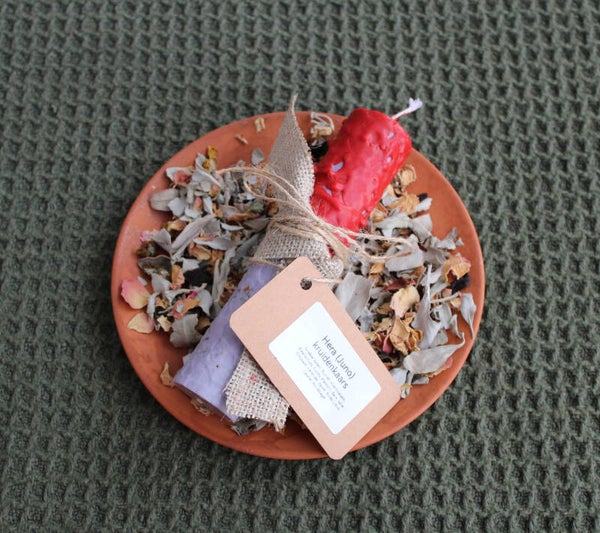 - De Hera (Juno) kruidenkaars is verrijkt met essentiële oliën van Griekse zaden, bijvoet, vlierbloesem, eikenschors, cipres, meidoorn, tonen van witte berk, salie, volledige maansverduisteringscyclus