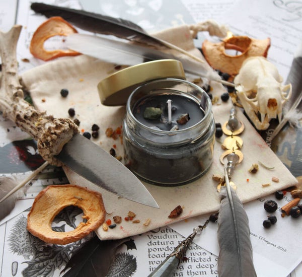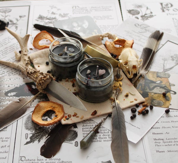 - De sojawas is met zorg gekleurd in diepe, mystieke tinten, waaronder een intens zwart, wat de mystieke sfeer van Samhain weerspiegelt.