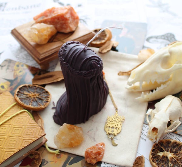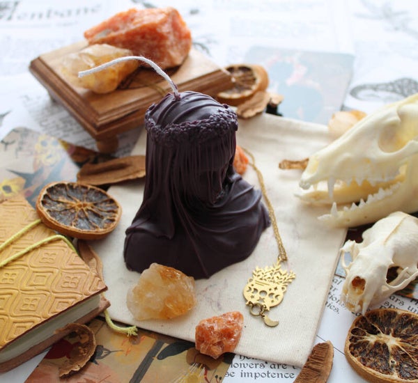 Altaarkaars in de vorm van de gesluierde maagd: een krachtige heksen representatie van een vrouw met magische krachten. Zij belichaamt zowel maagdelijkheid en bescheidenheid als de verborgen sensualiteit en onthulling van vrouwelijke kracht. Deze heksen kaars symboliseert ongeschondenheid en afzondering, terwijl ze tegelijkertijd de seksuele en vrouwelijke potentie benadrukt.