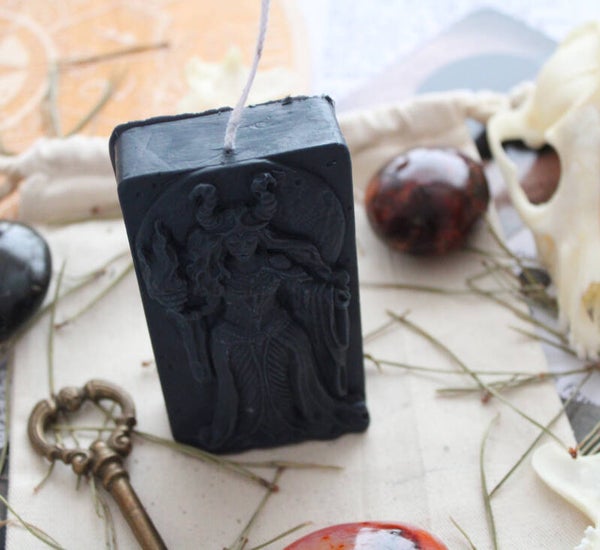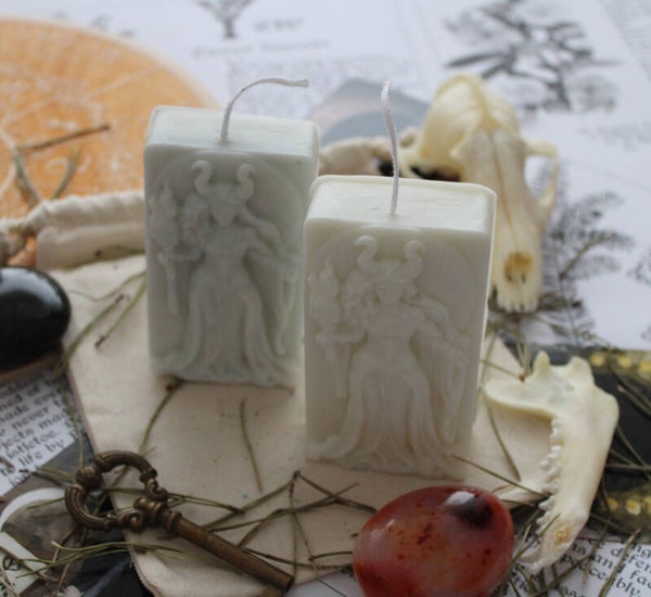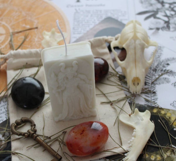 Laat je betoveren door deze unieke vierkante kaars, geïnspireerd door de Griekse godin Hekate. Met haar vurige vleugels staat Hekate symbool voor magie, hekserij, kruispunten, geesten en de onderwereld. Deze bijzondere kaars is meer dan een sfeermaker; het is een krachtig spiritueel hulpmiddel dat perfect past in je altaar of heilige ruimte en je helpt een diepere verbinding te maken.